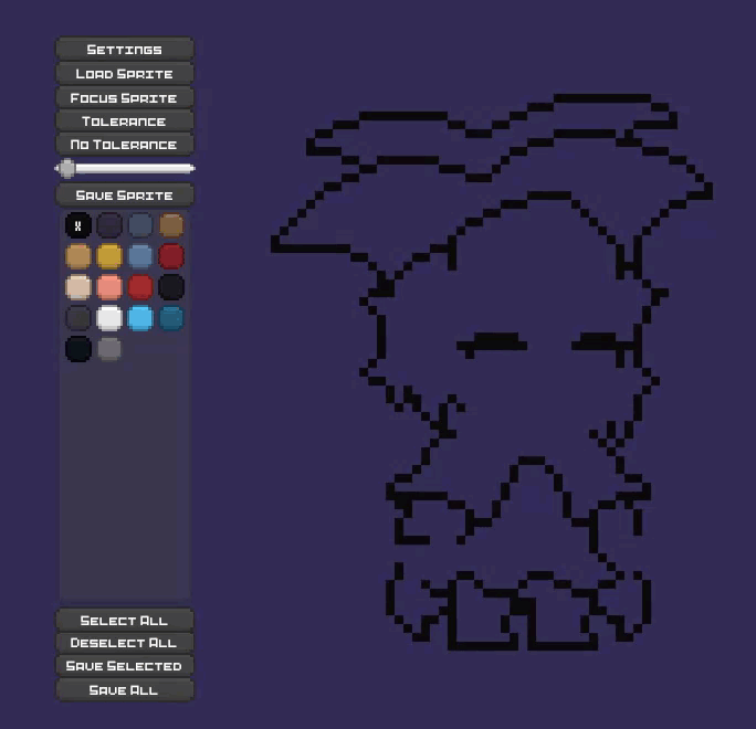 SAPixel 1.0 - launch Added ability to load sprites Color palette gathered from loaded sprites Ability to select or deselect palettes Tolerance [0-100] based on...